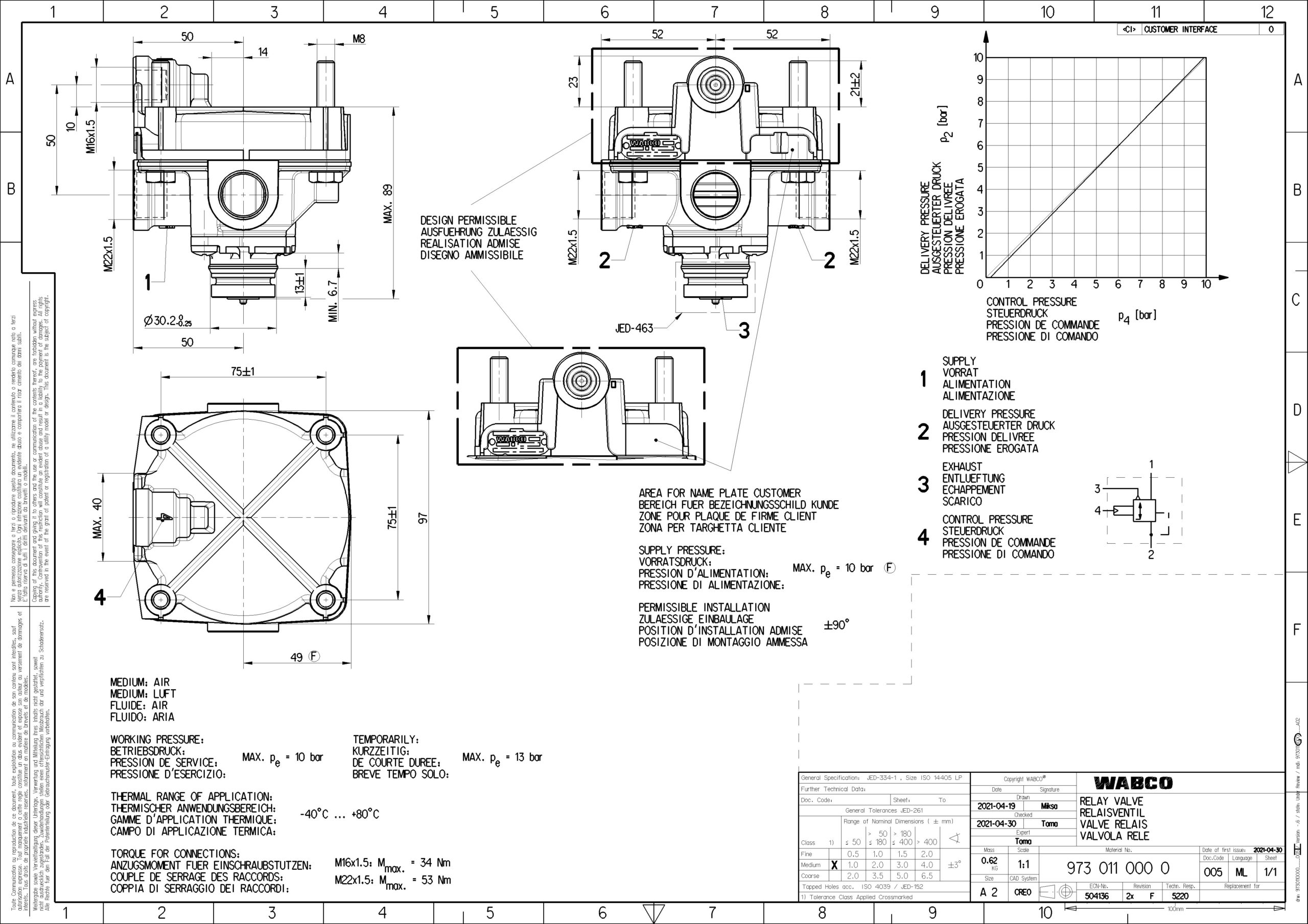 Presión ingreso: Presión egreso: Puerto 1: M22x1.5Puerto 2: 2x M22x1.5Puerto 3: JED-463Puerto 4: M16x1.5Presión Max: 10BAR