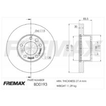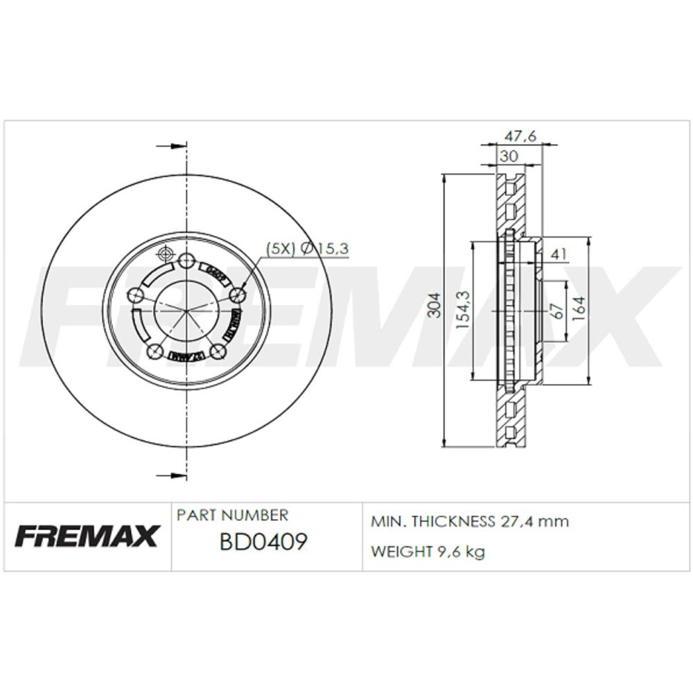 Ø Externo: 304mm Ø Eje Central: 67mm Altura: 47.6mm Agujeros: 5 Espesor Pista: 30mm Espesor mínimo: 27.4mm Descripción: