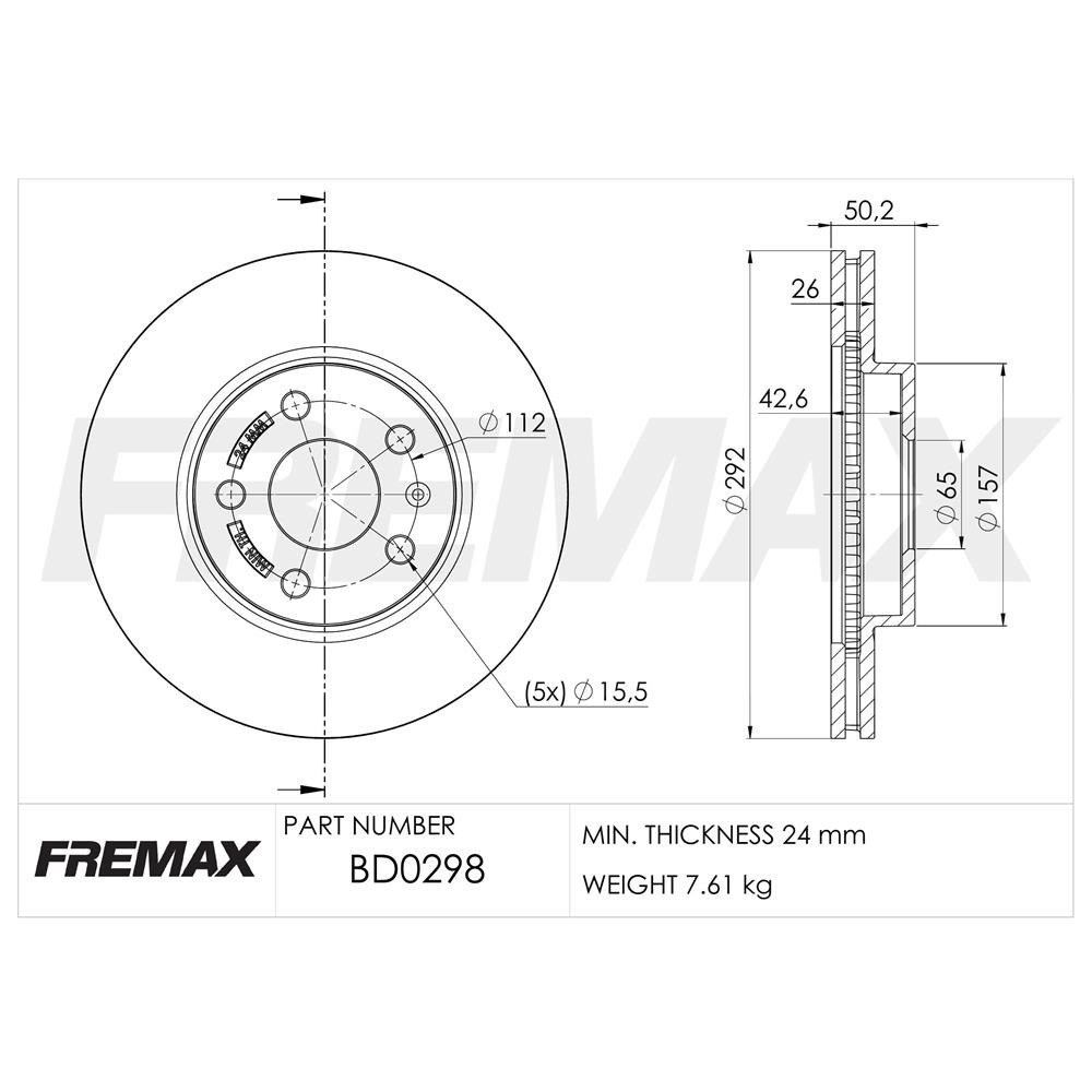 Ø Externo: 292mm Ø Eje Central: 65mm Altura: 50.2mm Agujeros: 5 Espesor Pista: 26mm Espesor mínimo: 24mm Descripción: