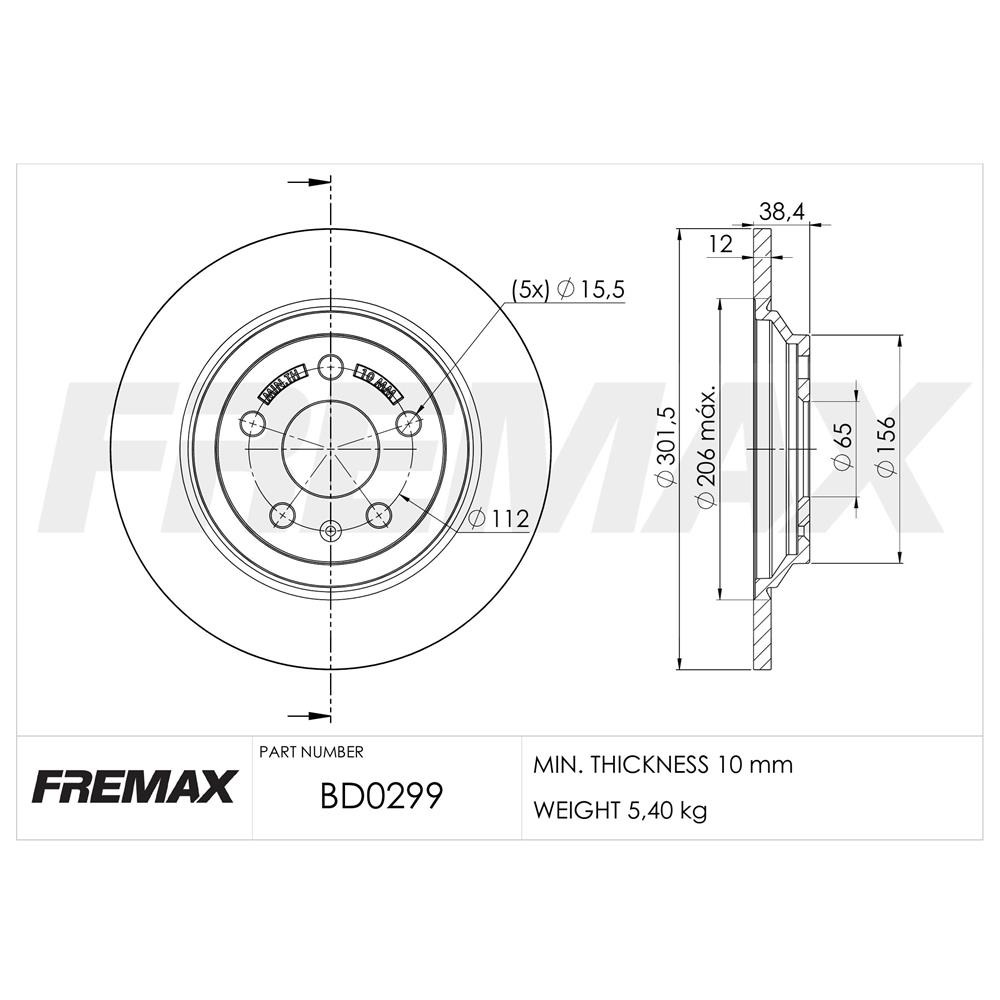 Ø Externo: 301.5mm Ø Eje Central: 65mm Altura: 38.4mm Agujeros: 5 Espesor Pista: 12mm Espesor mínimo: 10mm Descripción: